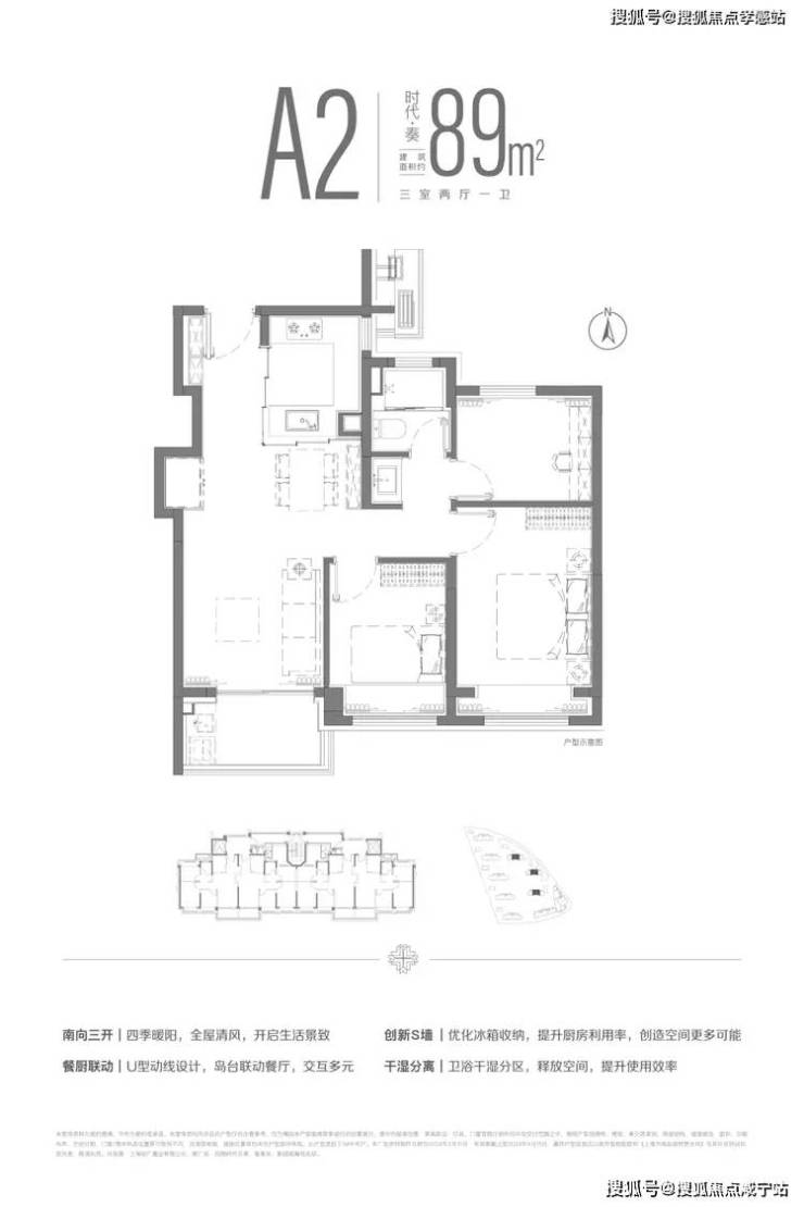 招商时代乐章售楼部电话:400-8800-703☎️☎️✅✅✅户型图赏鉴约89m²三房两厅一卫户型,LDKB一体化设计,南向三开间布局,全明空间设计。让四季流转于生活之中,用自然营造生活的惬意。