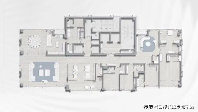该户型呈三梯一户的设计,同样是约3.6米的奢阔层高,朝南横向跨度超37米,会客厅面宽超18.5米,空间奢阔;户型东、南、西三面全景玻璃幕墙,超270度环幕视野景观震撼。