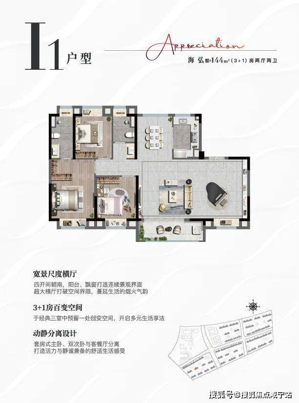 户型解析:宽景尺度横厅,四开间朝南,阳台、飘窗打造连续景观界面,超大横厅打破空间界限,蔓延生活的烟火气韵;3+1房百变空间,于经典三室中预留一处创变空间,开启多元生活享法;动静分离设计,套房式主卧、双次卧与客餐厅分离,打造活力与静谧兼备的舒适生活感受。