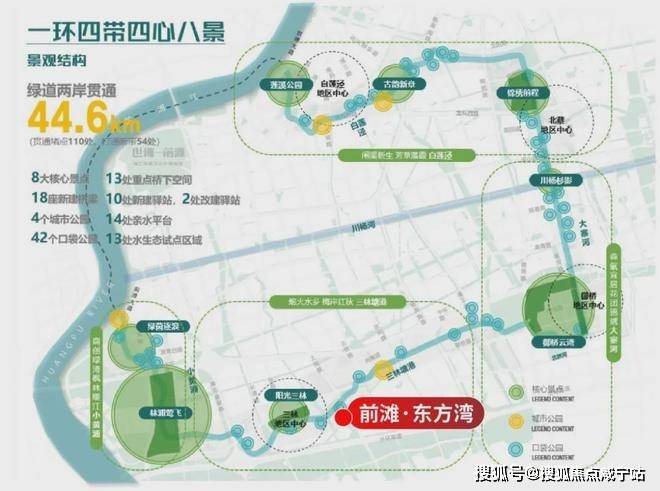 周边前滩友城公园、前滩体育公园、东明公园等已建成公园,三林塘港、“林浦莺飞”、“绿茵逐浪”等核心景点将连缀成片,形成气势磅礴的滨水公园带。