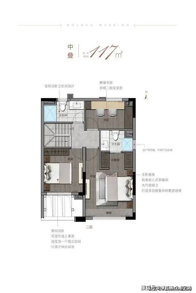 将卧室,衣帽间、独立卫浴和书房一体化配备,作为一个功能齐全的大套房,满足青年人工作、生活、亲子的全方位需求。