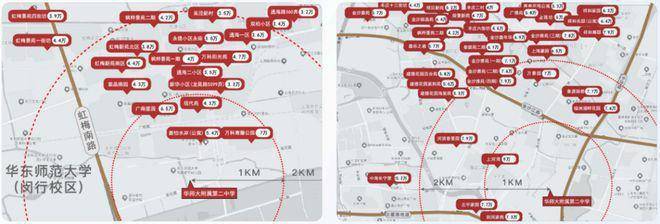 华二临港校区的落地,不仅提升区域教育能级,更带来二手房估值逻辑的重构。以现有的闵行及普陀校区为例,华二周边约3公里半径内的二手房价,离华二越近,二手房价越高,从外向内呈现明显的递增趋势。