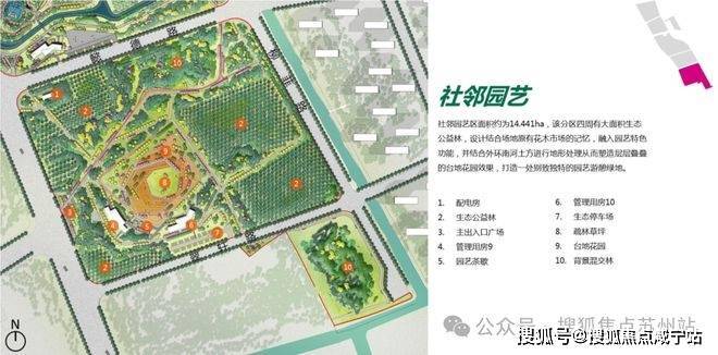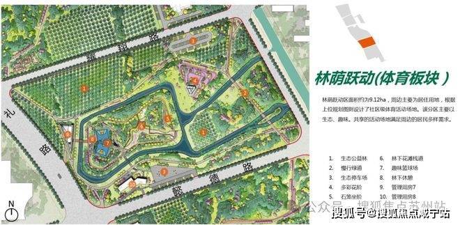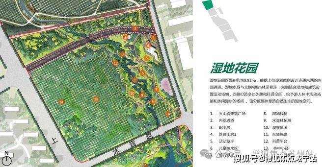 整座公园(在建中)划分为:湿地花园区、鸣湖共享区、林荫跃动区和社邻园艺区,四大功能分区。