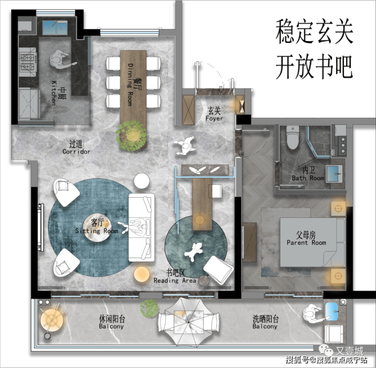 只需要简单地在大横厅中用玻璃移门隔出书吧区,便有了通透的个人空间。