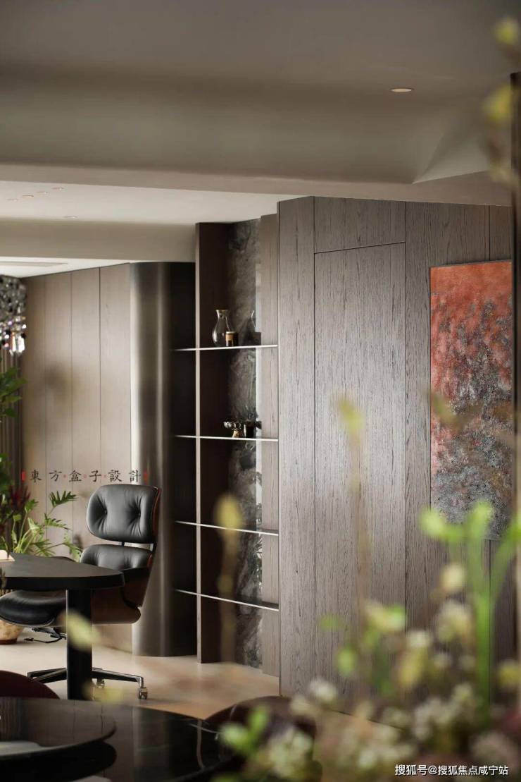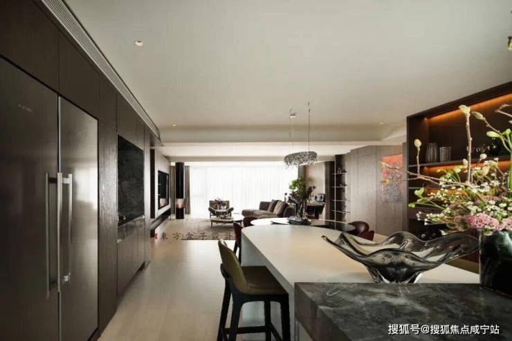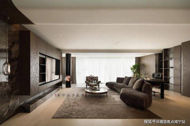 电视背景墙和深色大理石,虽纹理厚重,却通过“局部点缀+与木饰面拼接”的方式,避免大面积使用带来的压抑感,工艺上的“石-木无缝收口”,让材质衔接自然,进一步强化空间的整体感与开阔感。深棕系木饰面从墙面延伸至柜体,表面哑光处理弱化视觉重量,让木质元素成为空间的“温润纽带”,而非阻碍开阔感的厚重存在。古铜色茶几框架、黑色金属壁炉等金属元素,以小面积、高质感的形式出现,在提升轻奢感的同时,绝不喧宾夺主,保障空间的通透基调。