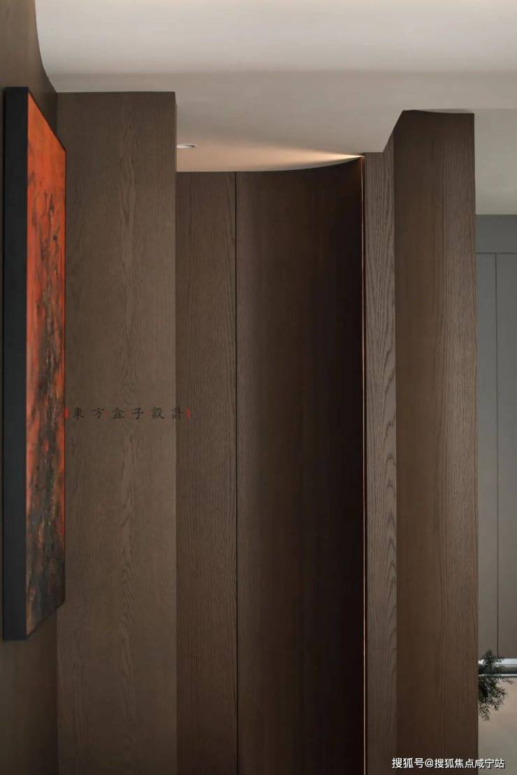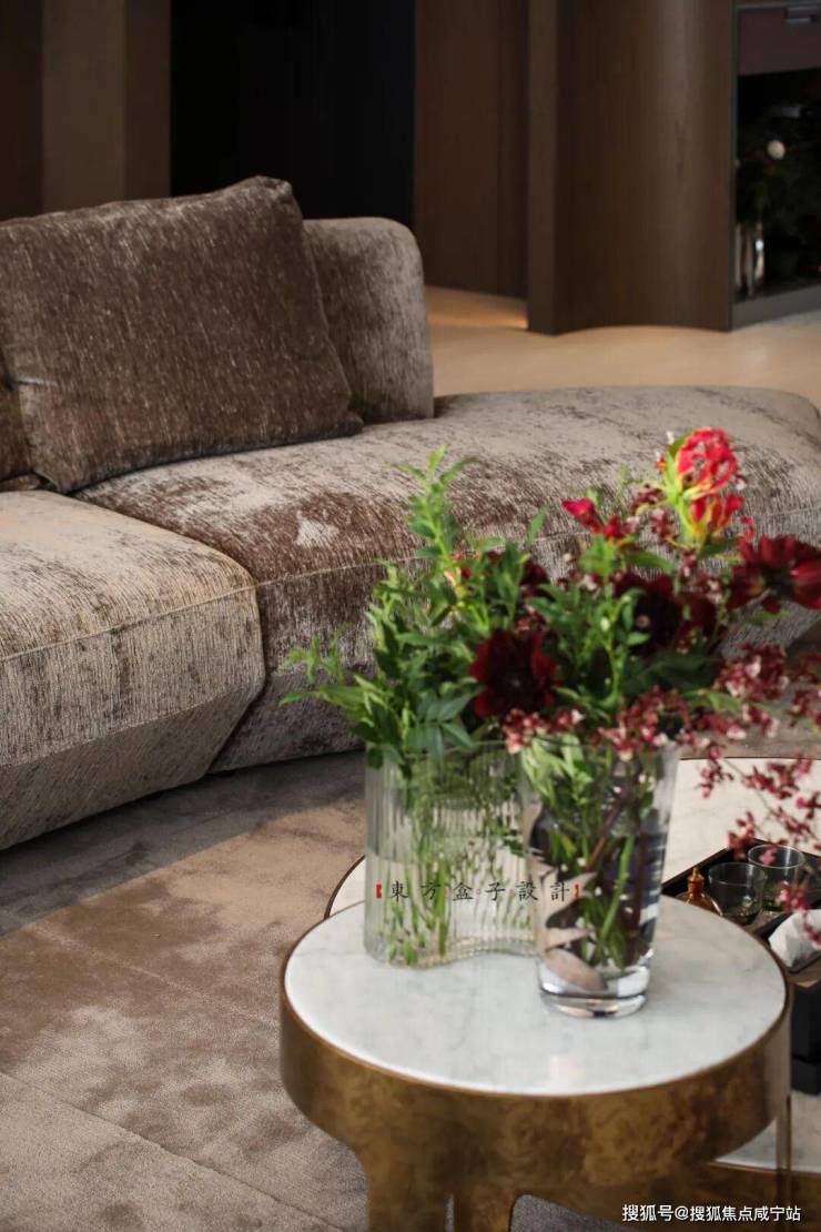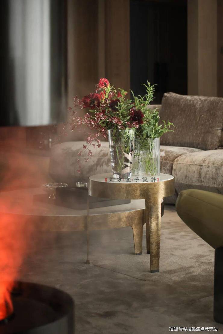 家具造型以圆润、简约款为主,尺寸与空间比例精准适配,避免厚重感对开阔感的破坏。陈设艺术以“点睛”为原则,茶几上的花艺色彩浓烈却不繁杂,橙色艺术画作在深棕基调中注入活力,壁炉的仿真火焰装置则成为艺术化的生活点缀——所有软装都在“精致表达”的同时,绝不挤压空间的开阔感。