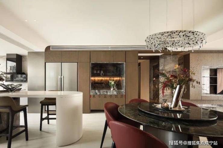 偌大的客厅与阔绰餐厅、宽敞U型厨房相连,这里不仅容纳一家人的欢声笑语,在周末与朋友聚餐、开轰趴也都不在话下,客餐厅一体化设计,实用性舒适性堪称一流!