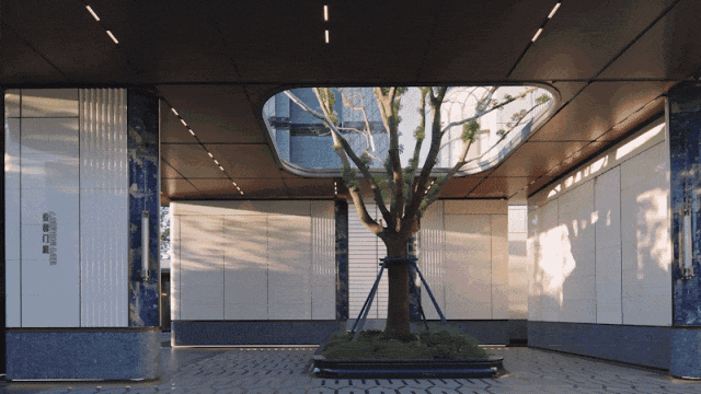 继续漫步前行,一处屹立着以武康大楼的建筑符号为基底,以现代曲线与玻璃工法为笔触的艺术地标,倒映着时代光景的镜水院落徐徐展现。
