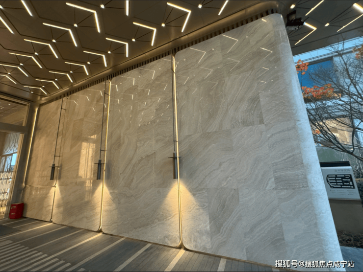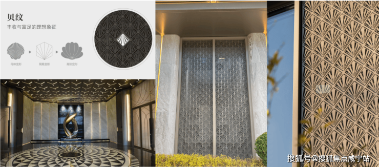贝壳纹元素多次出现在外部景墙、建筑立面、入口雨棚星空顶、甚至在室内精装的地面内,都有呈现