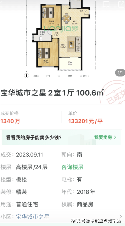 但是,现在在二手房市场,宝华城市之星,一枝独秀,某绿皮网站显示,项目在今年9月11日就成交了一套100㎡房源,成交单价高达13.3万!
