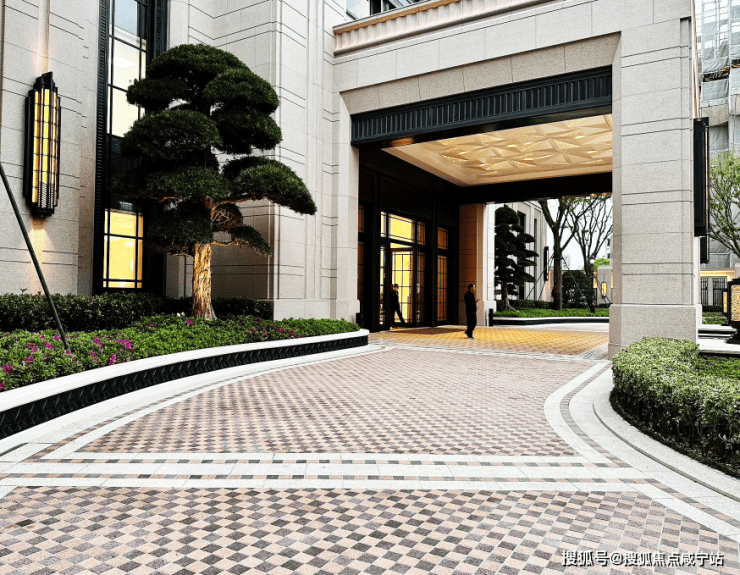 门口的迎客松,棋盘格式的地板铺排,天光漏隙式的门口穹顶,彰显了归家仪式的门面。