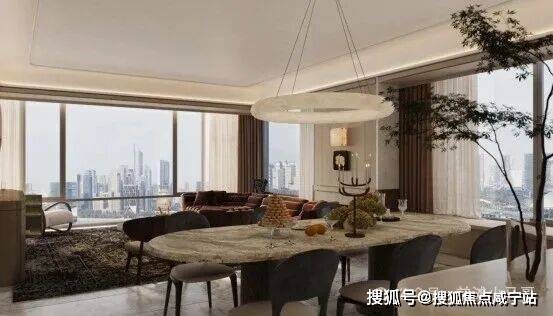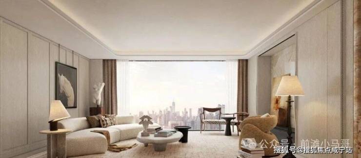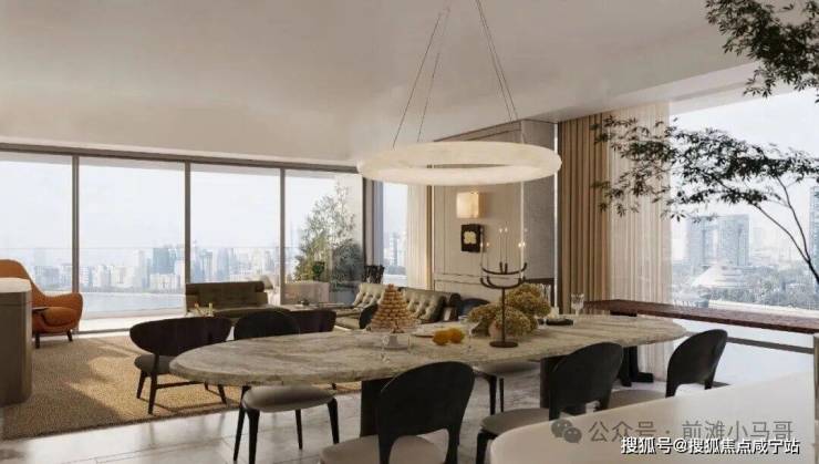 设计背书由问鼎国际大奖的著名设计师吴滨操刀,延续其“汤臣一品5亿顶复”的“摩登东方”理念。以黄浦江为灵感,营造“阅尽千帆后的宁静与松弛感”。通过8.5米南向宽厅、270°环幕玻璃、无冗余装饰的减法美学,让空间如江面般舒展,视野极度开阔。
