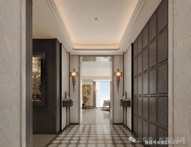 而且这个空间的装标也是非常精致的,1.7米双扇铸铝门,搭配宝格丽石材与祥云灰拼花,延伸至电梯厅。皇家白玉石玄关,兼具储物与展示功能,质感温润。