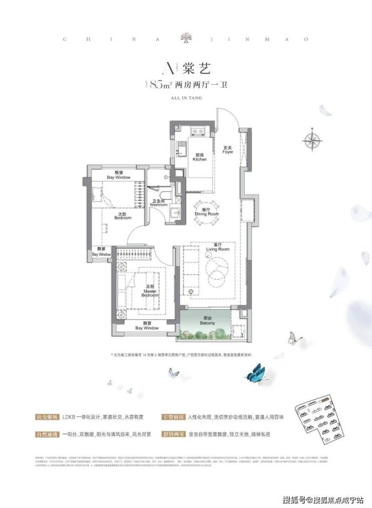 建面约105㎡3房2厅2卫,做到了三开间朝南+4个飘窗+双面阳台系统+主卧套房设计+270°转角飘窗,该户型的居住体验、舒适度、尺度感,是同级别产品所无法比拟的。