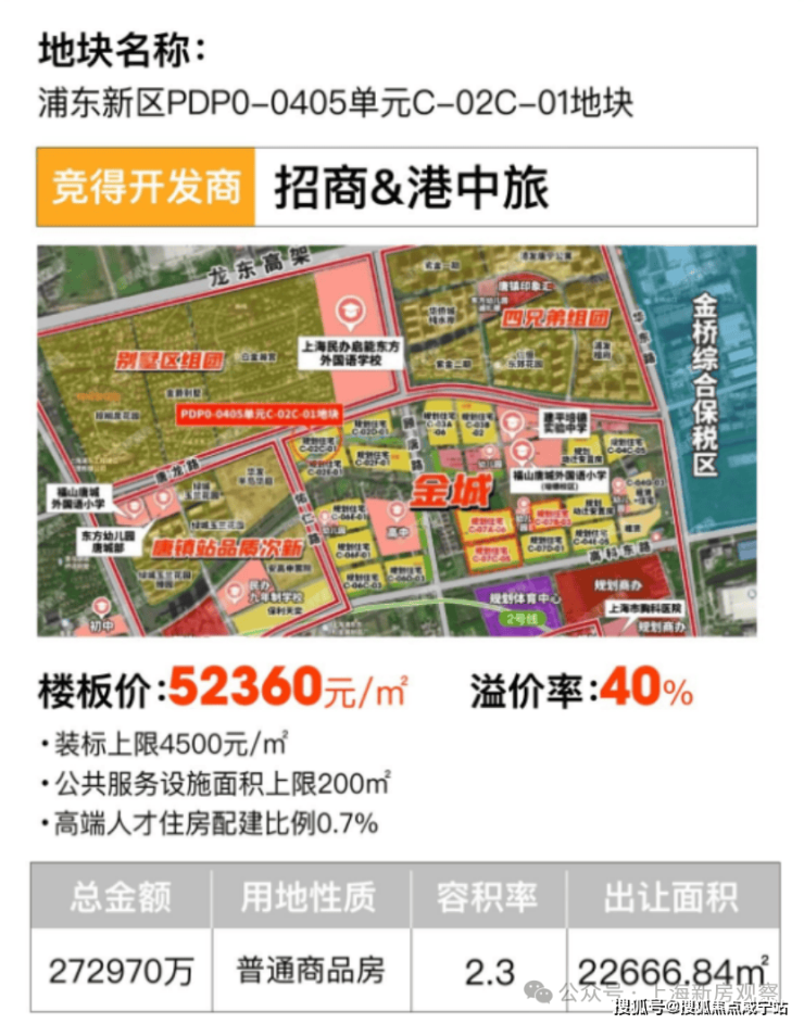 土拍重磅新闻——7月25日上海六批次土拍结束,唐镇地块再次赚足市场眼球!经过62轮鏖战,最终由招商&港中旅以总价27.3亿,楼面价5.24万元/m²夺得!溢价率突破40%!!!未来售价预计将突破9万/m²,已迎来价值爆发窗口期!