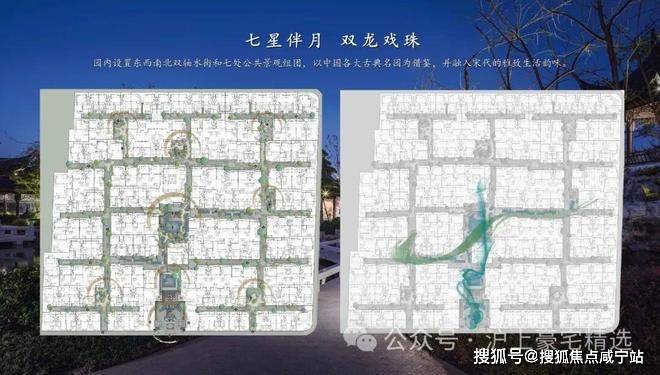 园内布局五进制南北主轴、以及“双龙戏水”格局的双水街,巷道联通,设七大景观组团,形成“一环、两轴、七境”布局。175席中式园宅,依巷分布南北,横平竖直,秩序井然。