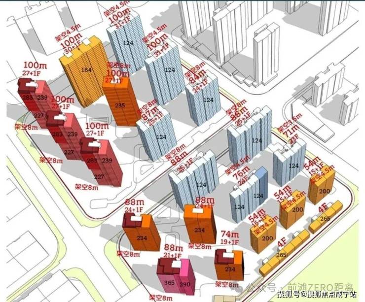项目规划了七栋百米高层住宅(28-32层)、1栋83米高住宅(25层)和一栋86米高住宅(26层),容积率非常大。全部楼栋均采用一层架空设计,西侧四栋南偏西建筑群下设置了超大尺度的下沉庭院。