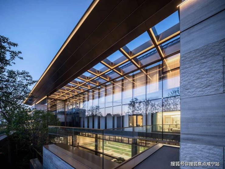 叠墅立面采用大面积玻璃,局部石材+铝板线条,山墙区域为涂料!