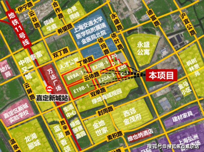 项目地块位于嘉定新城核心位置,距离11号线嘉定新城站直线仅约150米,紧邻万达广场,北侧是瑞金医院北院。