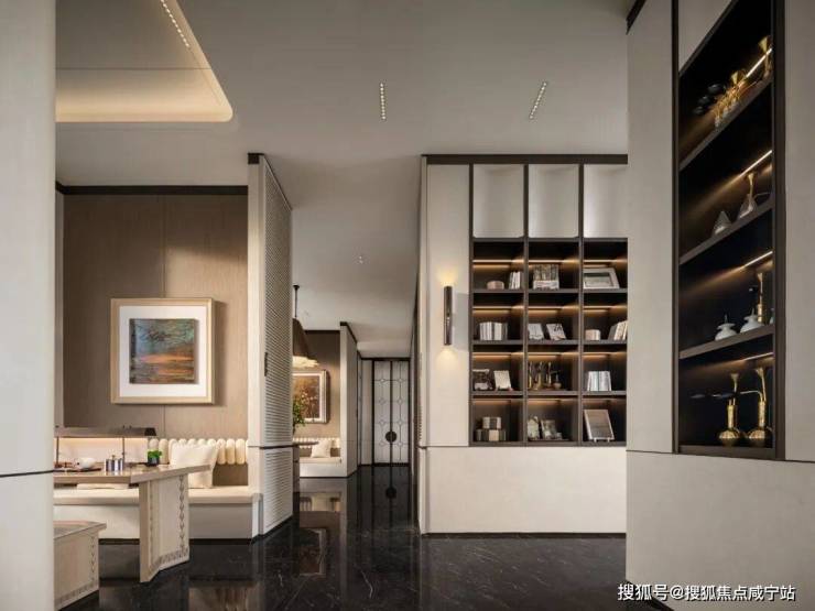 首先是奢石含量极高,从入户处的玲珑玉拼花与透光云石辉映,到翡翠绿奢石墙景、再到发光云石装饰点亮归家路,石材的典雅贯穿始终。