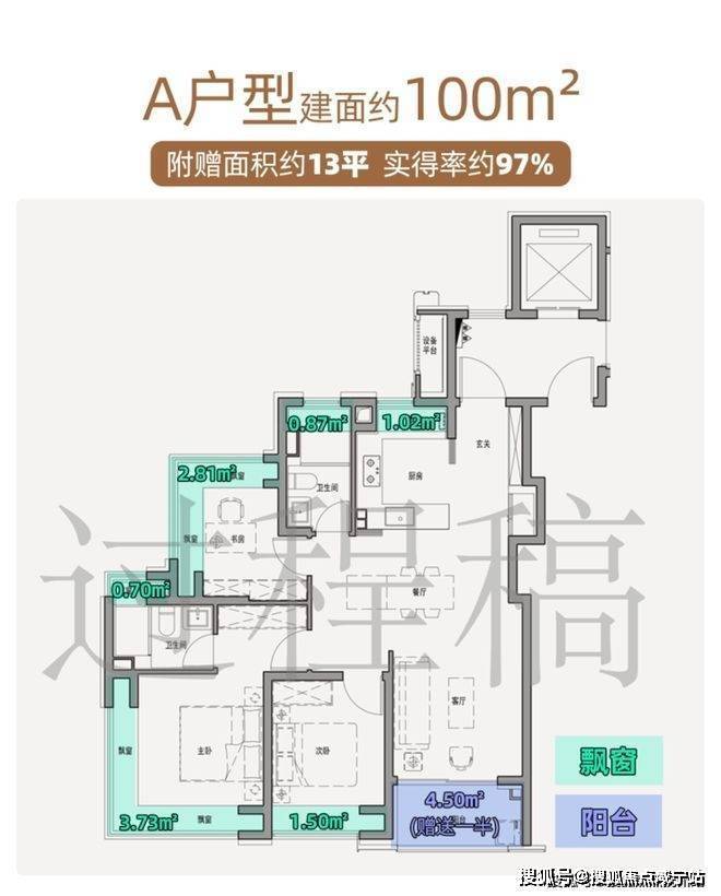 全屋7飘窗+半封阳台,赠送面积近20㎡,实得率约94%。