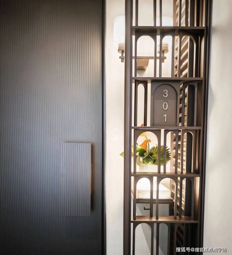 比如,门口的墙上会有门牌号,墙上的壁灯,增加归家仪式感(寓意:家里总有一扇灯为你亮着)入户门用的是六合一的铸铝门。