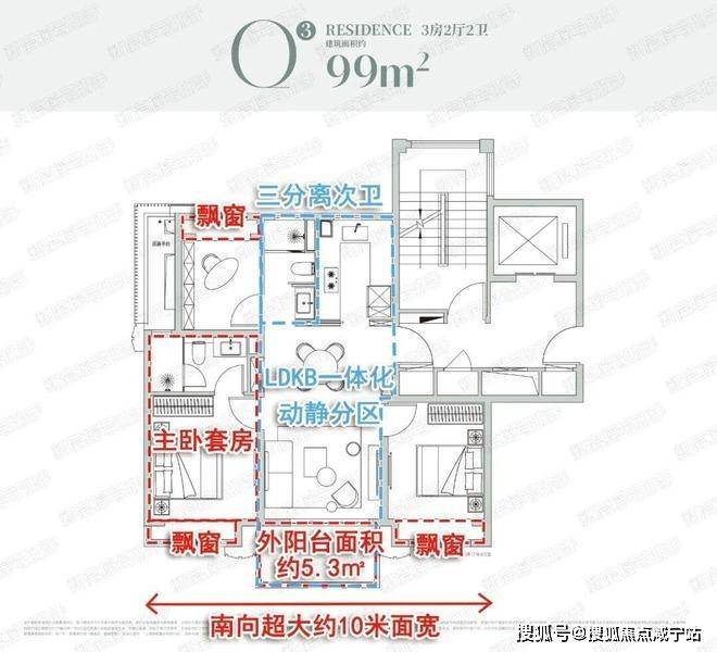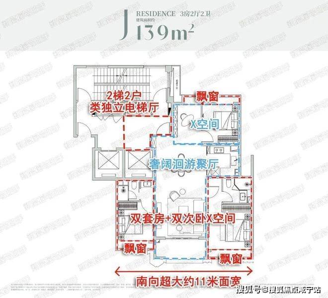 全屋飘窗设计,南向双套房卧室均配备独立衣帽收纳+卫生间设计,居住舒适度、景观视野与隐私性相当优秀!