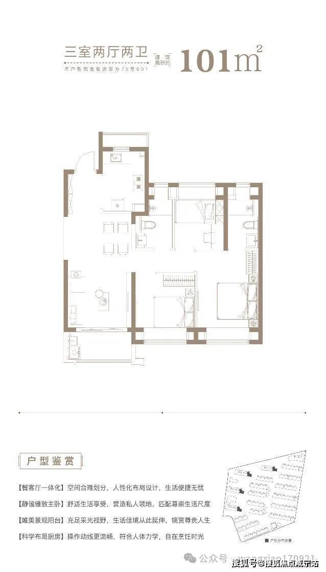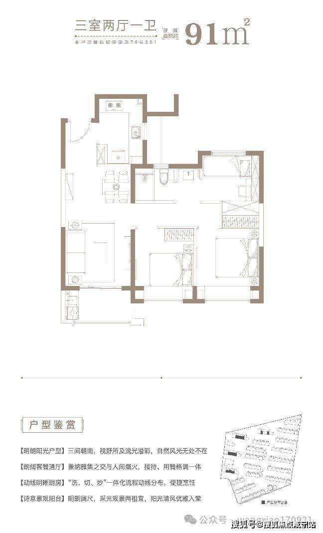 建筑面积约84-101㎡瞰景高层,方正格局,正向朝南,采光性和通风性都非常优秀;动静分离、干湿分离更是不在话下;而且推窗便能看见高尔夫绿洲,视野极为优越!
