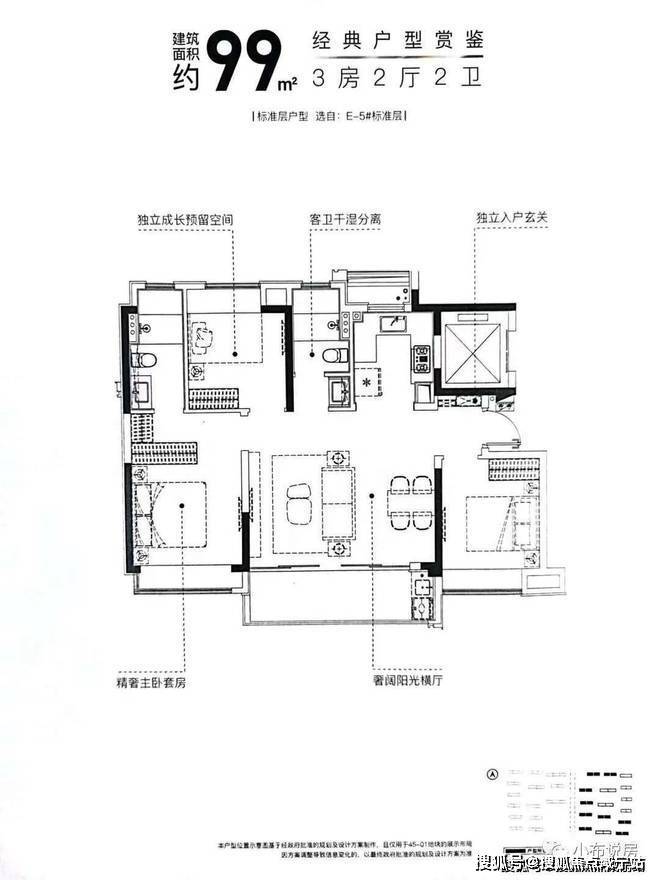 不同于市场上千篇一律的99㎡三房两厅两卫户型,项目做了四开间朝南的格局,面宽约5.3米的宽景外阳台设计,大尺度的采光,居住的舒适度不输于市面上的大三房。