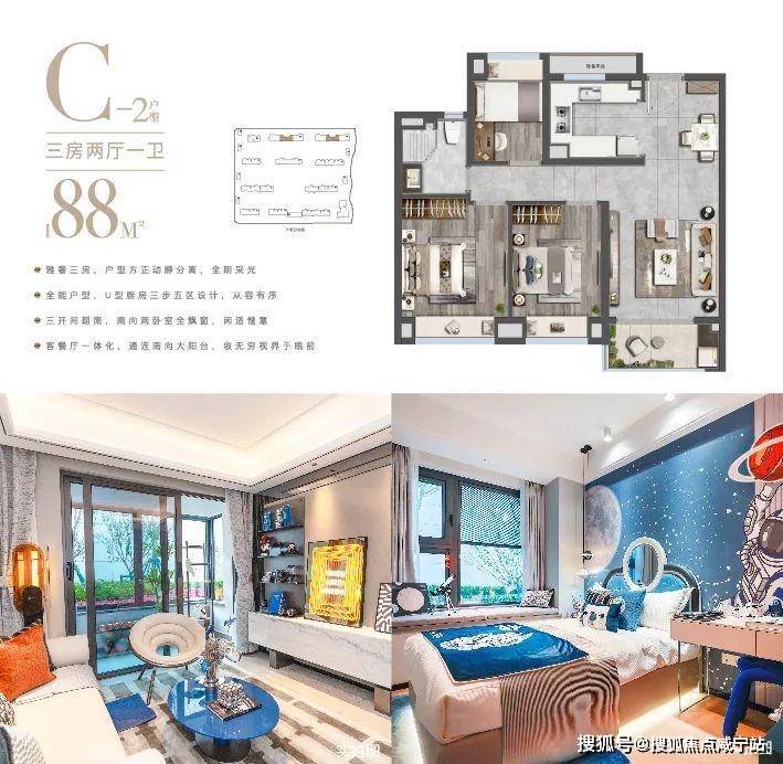 作为项目备受关注的户型,建筑面积约88㎡户型以“三开间朝南+全明格局”突破传统刚需户型设计理念,三房设计适配从单身到三代同堂的全周期需求,飘窗与观景阳台增强空间延展性,满足年轻小家庭多方面需求。