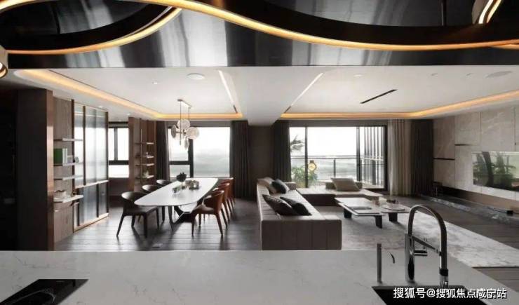 ▲餐厅旁边是书房空间,以长虹玻璃推拉门作为隔断,在金属边框的设计下,与餐厅的吊灯形成呼应,门两侧是木饰面+吊架书架的设计,也是显得简约华丽而高级。