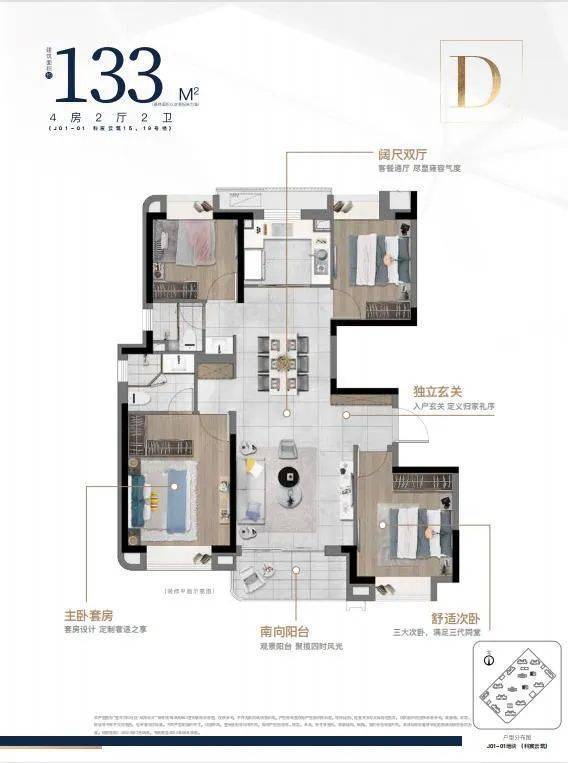 建筑面积约133㎡/143㎡四房两厅两卫,大开间,在满足空间感的基础上,增加户型的功能性,承载生活高舒适度;其中建筑面积约133㎡的四叶草户型,主卧套房设计,三代同堂各有私密天地;南向观景阳台,饱览阳光美景,双卫设计,提供更多私密空间与生活便利。