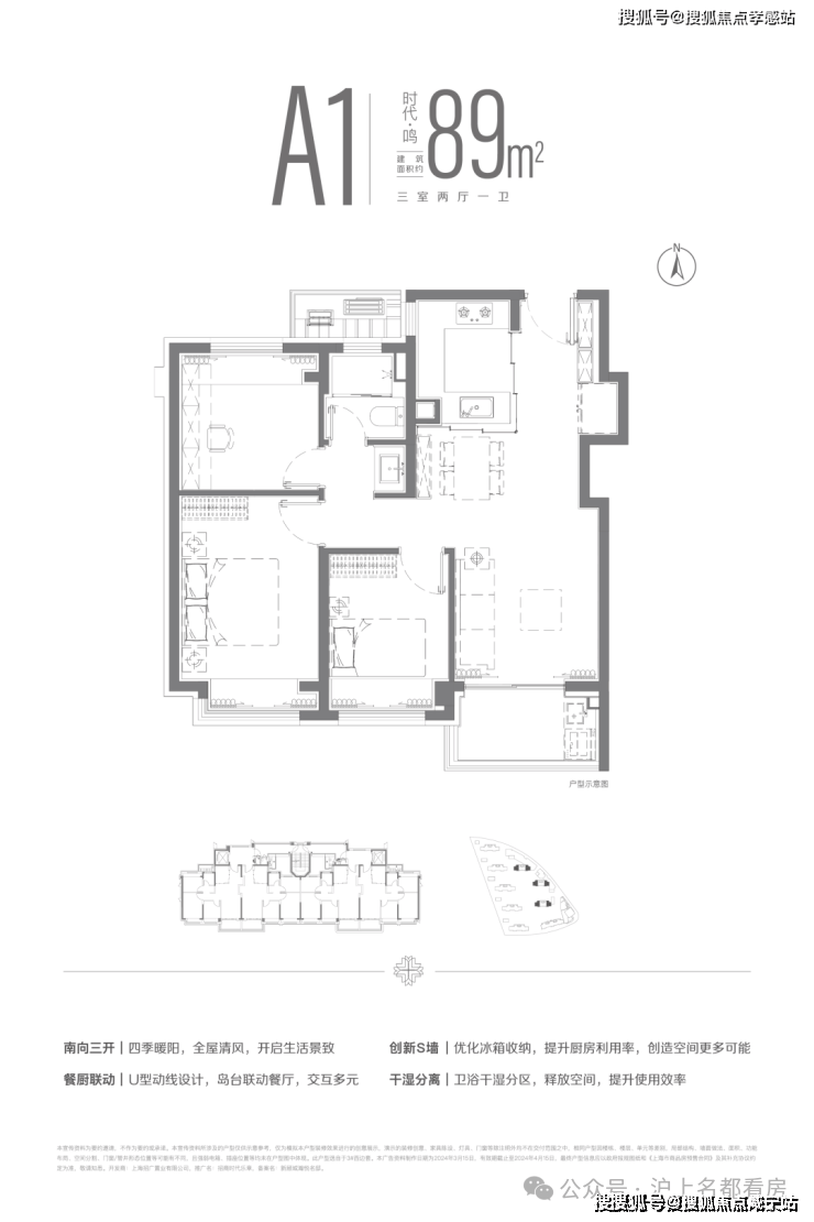 89㎡三房:三开间朝南,U型厨房+独立玄关,空间利用率82%