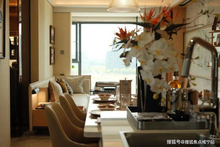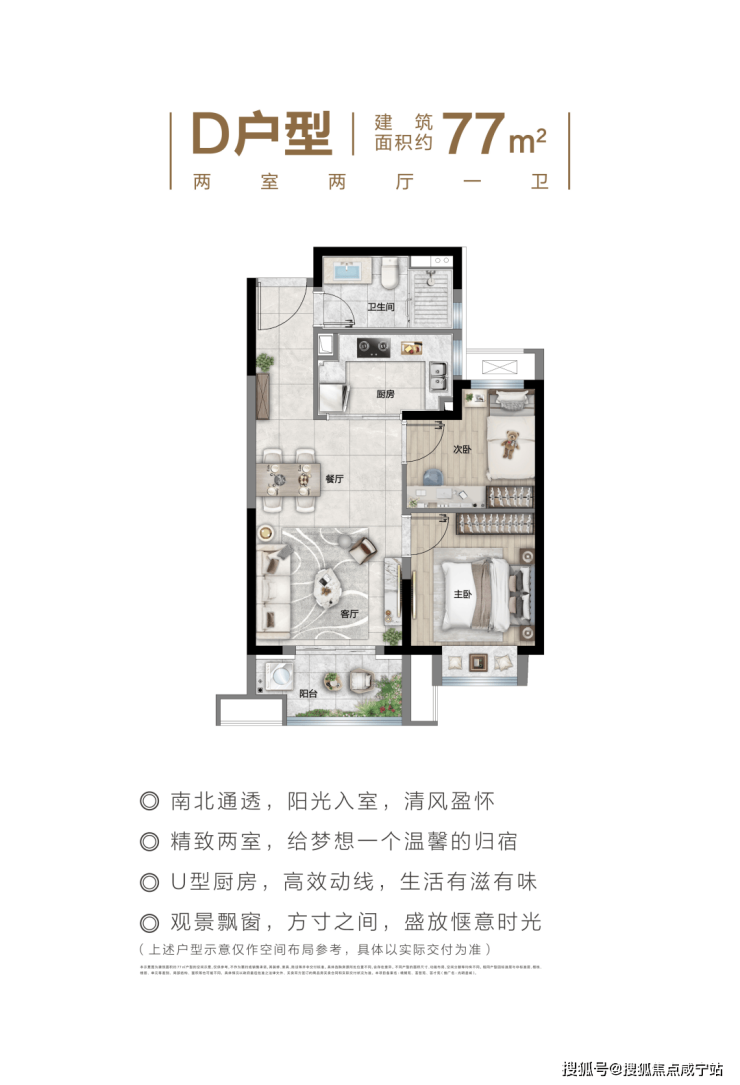 紧凑而不失功能性,U型厨房衔接景观阳台,餐客厅一体化布局提升空间感,适合新婚夫妇或小家庭。