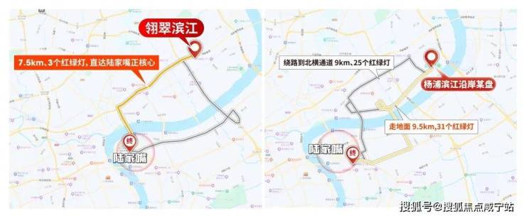 其他滨江一线的项目,想要去往浦东、浦西核心商圈,都要绕到翎翠滨江所在的片区,才能驶入快速路网。