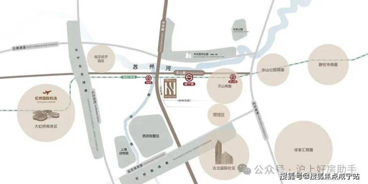 【地铁2号线】直线距离威宁路站约800m,北新泾站约300m,东向2站中山公园,4站静安寺,6站人广,9站陆家嘴,直抵浦东国际机场,西向3站虹桥2号航站楼,4站虹桥火车站,是上海名副其实的国际线。