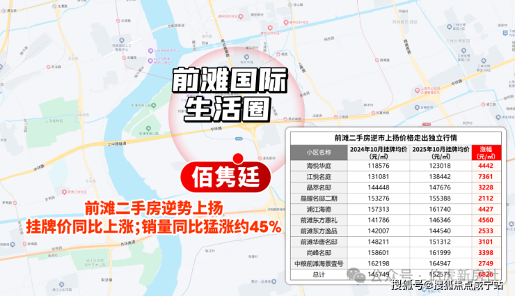 价格上,在约98%板块挂牌价同比下降的当下,前滩多数小区仍保持 价格坚挺;销量上,今年1-10月二手房成交约230套,同比 大涨约45.6%,印证板块吸引力。