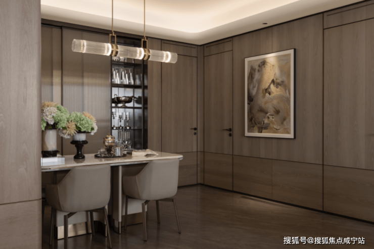 其一,室内没有门与墙的生硬拼凑感,而是通过大量木饰面、隐藏门等细节,形成统一的设计语言,色彩与材质搭配协调统一,尽显整体美感。