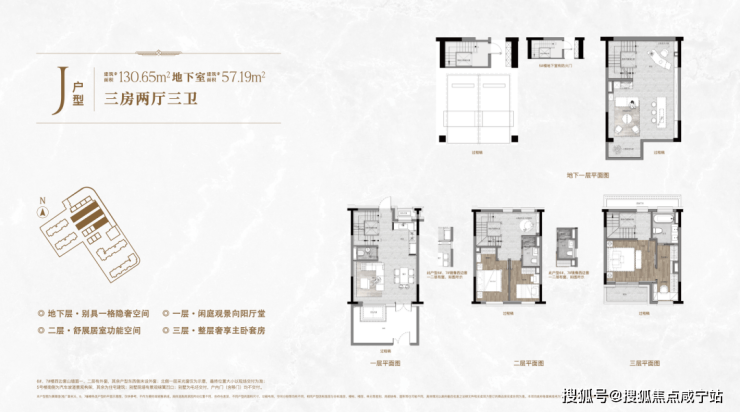 「興華里」建筑面积约130.65㎡户型(以J户型为例),地上三层+地下一层的设计,以“垂直分区”打破传统别墅的面积桎梏。