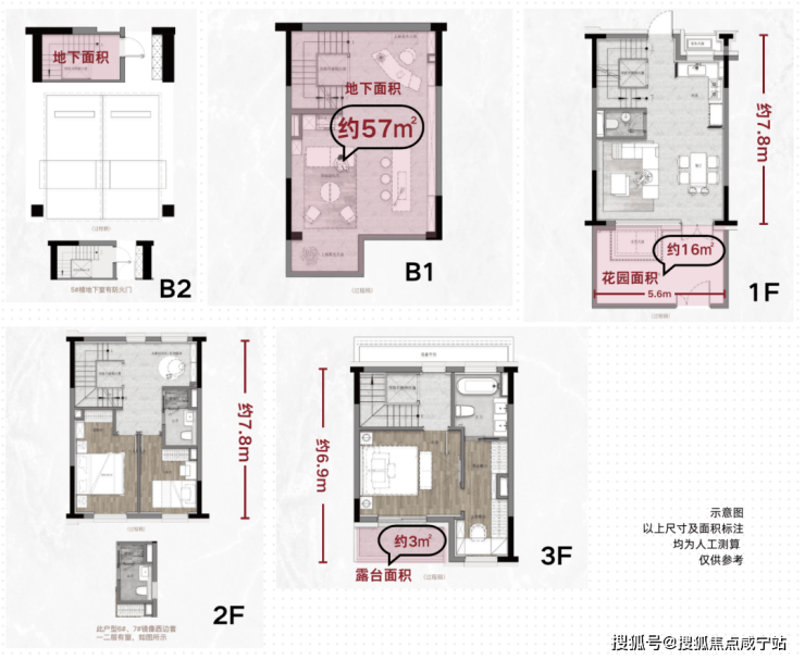 地下面积预测约 57㎡;1、2F 轴线进深约 7.8m;3F 轴线进深约 6.9m;