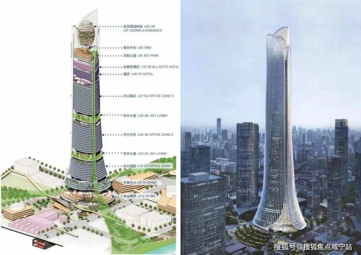 这栋建筑面积近45万m²,地上99层、地下4层,业态涵盖办公、商业、五星级酒店,还规划有停机坪的“浦西之巅”超级地标