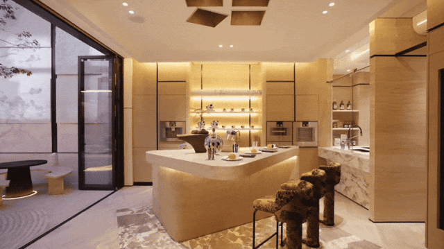 中西厨以玻璃门作为区隔,满足多元化的生活场景。可开可合,更贴近当代都市生活。