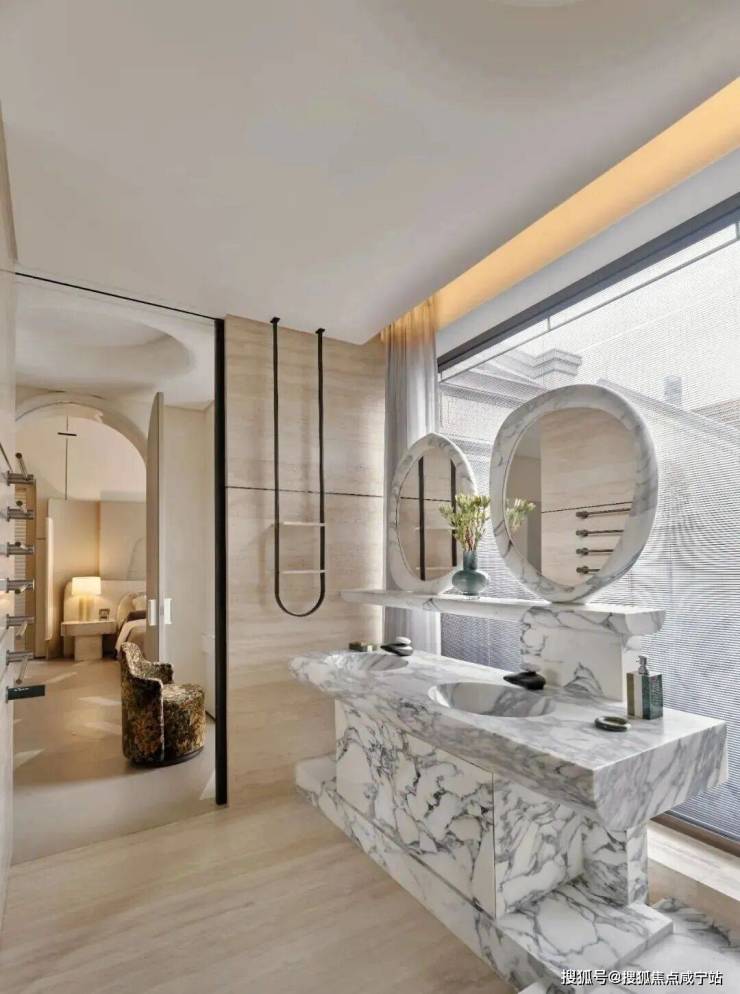 整体以米白色调为主,加入了少许鲜亮橘色,烘托休憩情绪。主卫浴采用双台盆设计,方便双人同时使用,由天然洞石打造的卫浴空间更具有一种低奢隐逸的度假气息。