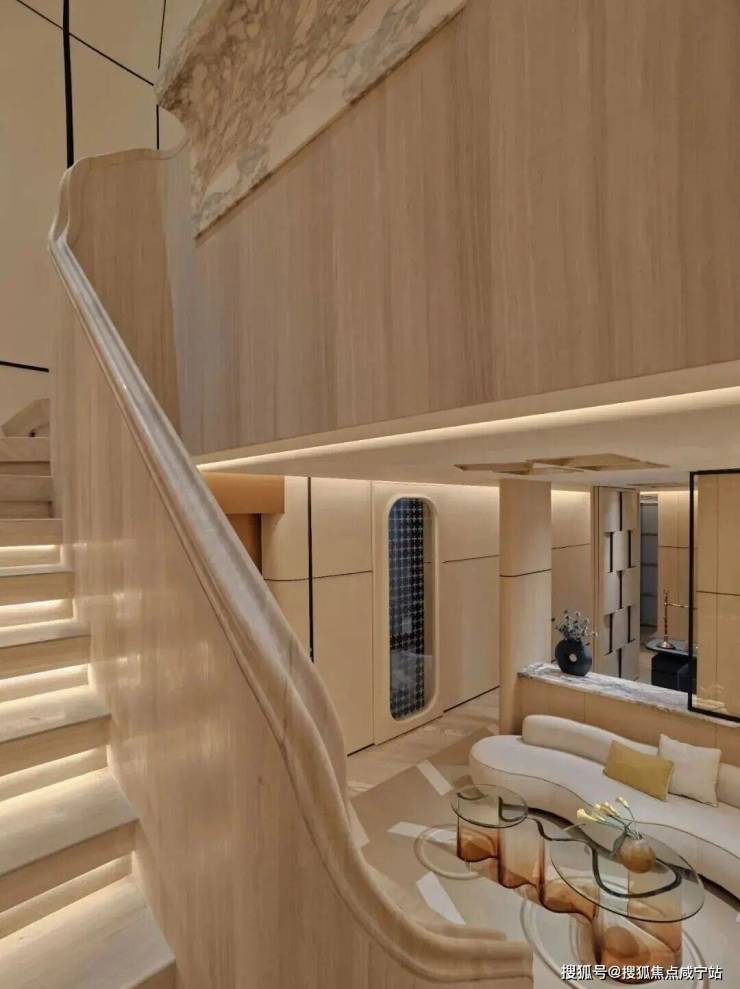 顺着弧形木质楼梯抵达地下空间,仿佛游走在一曲流动的乐章中。一切都共同呼应着水的特质,传递着低调隐逸情怀与圆融个性。