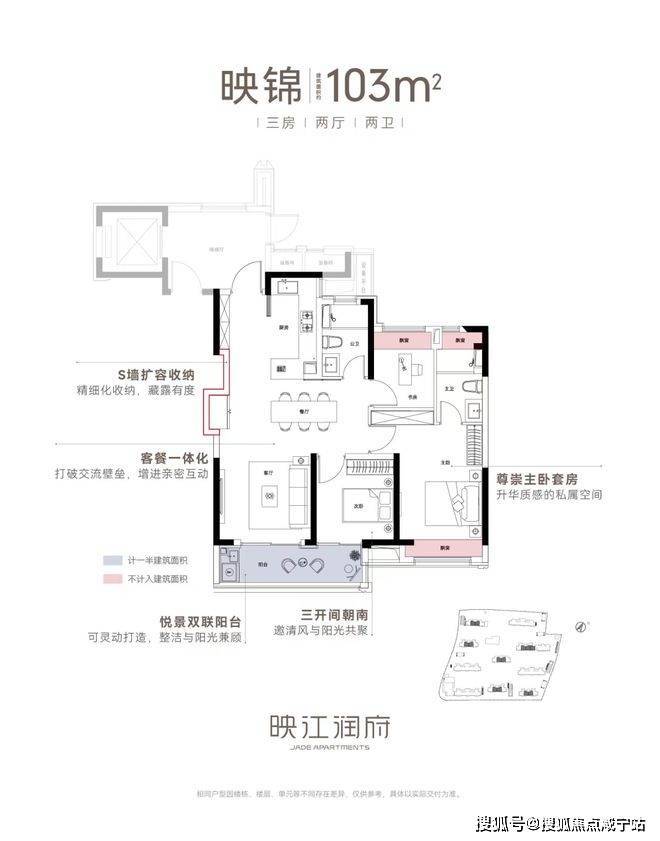 亮点五:双联阳台+多飘窗赠送、灵动空间。映江润府103户型,实现了100平级别难得的双联阳台,实现了室内空间的横向延伸,同时,搭配主卧、主卫、书房的“全飘窗”设计,赋予了空间更多灵动的使用场景。
