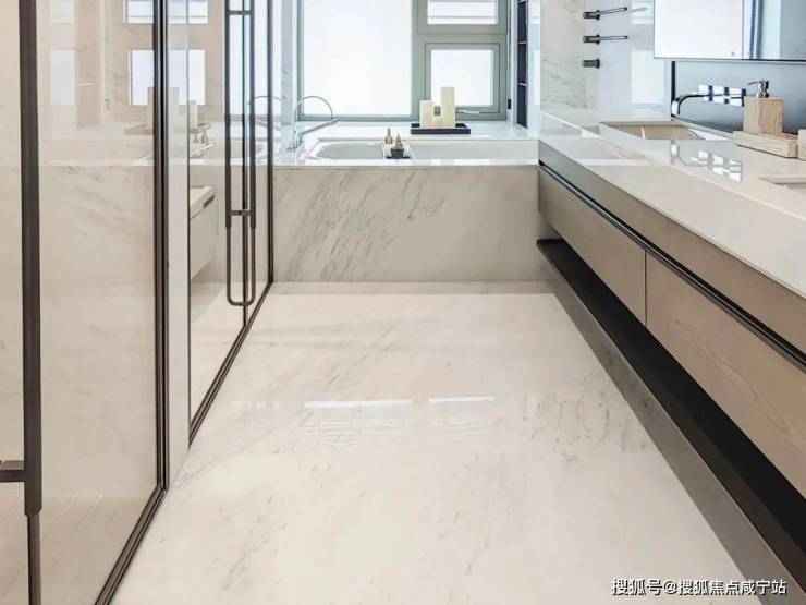 细节方面,足见开发商的匠心。比如电视背景墙采用高级感白色石材,主卫地面采用大理石,客餐厅、卧室屋顶弧形线条设计,窗户采用旭格的三玻两腔夹胶设计等,将生活细节考虑得非常到位。