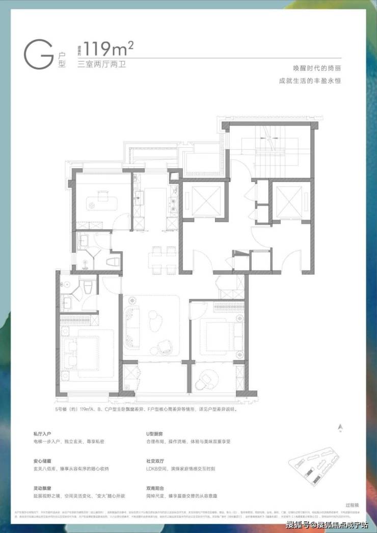 为了突出无遮挡的景观,约119㎡户型将其优势体现在双南向阳台设计,使采光和视野更为优越;