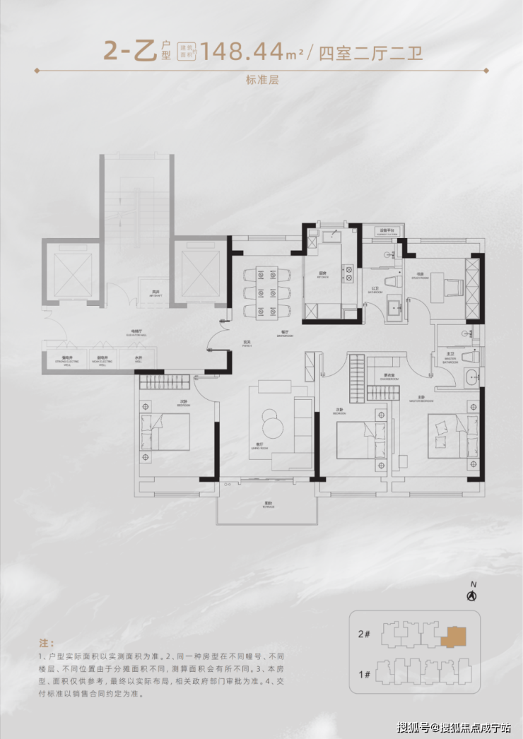 另还还有四开间朝南+多飘窗+主卧套房的约148㎡户型,适配多代同堂/二胎家庭。