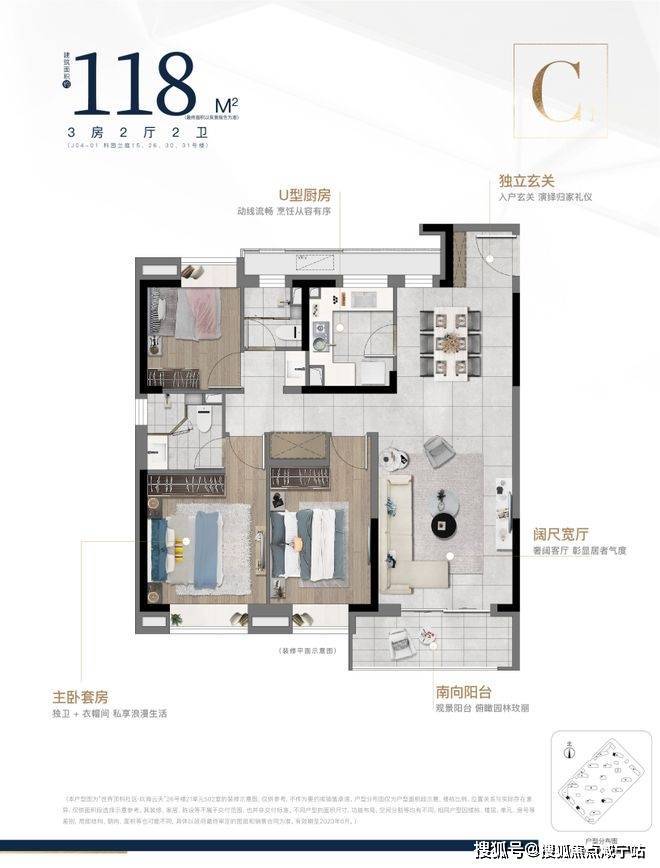 约128㎡四叶草四房:独立玄关柜、中西双厨、约6.8米双联阳台,满足三代同堂需求;