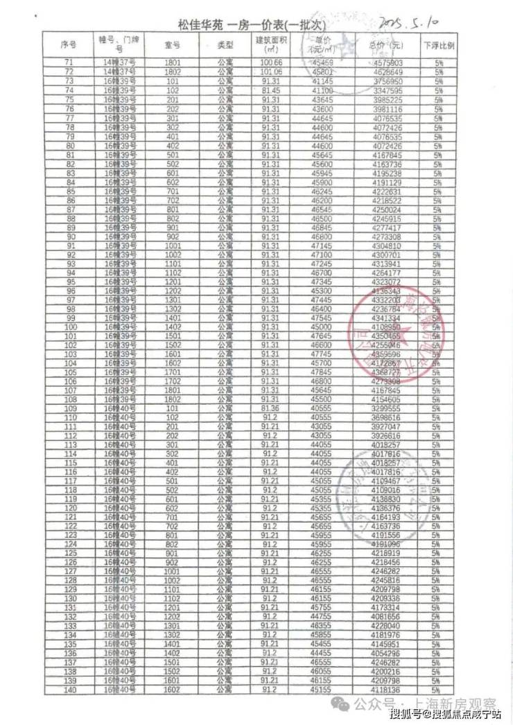 上期一房一价表如下